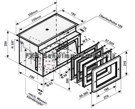 Beton-Einbauteil aus Edelstahl mit einer Einbautiefe von 240 mm, verstellbarem Deckelaufsatz für Öffnung im Beckenumgang und einer Saugbreite von ca. 200 mm, komplett mit Schmutzsieb, Skimmerklappe und Skim-Vac Deckel, zusätzlich mit Kammer z. Einbau eines Wasserstandsreglers.