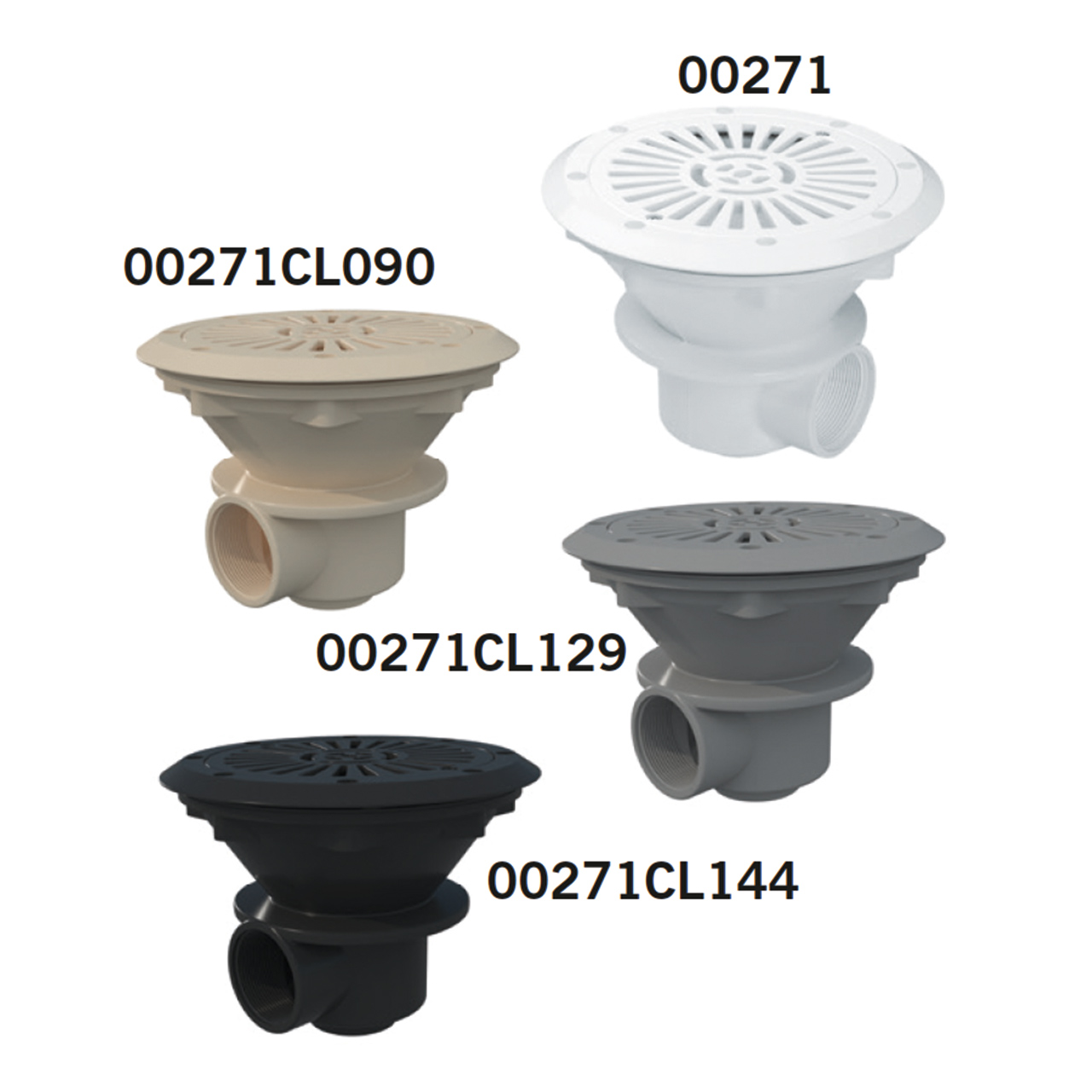 Großer Bodenablauf 210mm für Folienbecken mit Standarddeckel. Seitlicher Abgang 2“ (zusätzlich 1½“ unten, verschlossen). Gehäuse und Gitter aus ABS Kunststoff. Komplett mit Flansch, Dichtungen und Schrauben (mit Gewindeinserts). Maximale Durchflussmenge: 13 m³/h.