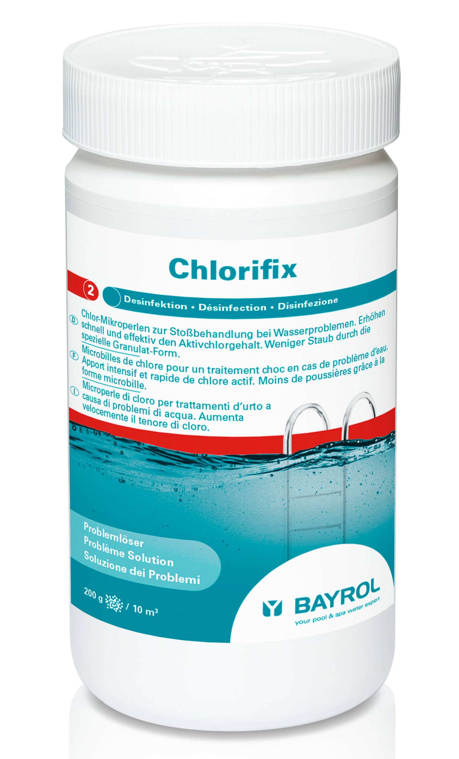 Chlorifix ist ein schnelllösliches Chlorgranulat zur Stoßbehandlung bei Problemen mit der Wasserpflege, und wird direkt ins Wasser dosiert. Durch den Einsatz eines besonders hochwertigen Rohmaterials erhöht Chlorifix schnell und effektiv den Aktivchlorgehalt. Geben Sie bei Problemen 200 g Chlorifix pro 10 m³ direkt ins Poolwasser zu.