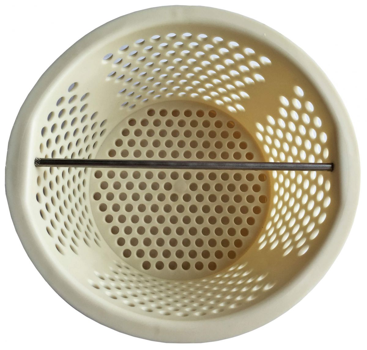 Kunststoff-Skimmerkorb mit stabilem Handgriff. Die Löcher im Siebkorb gewährleisten selbst bei starker Verschmutzung durch Laub einen kontinuierlichen, verwirbelungsfreien Durchfluss.
