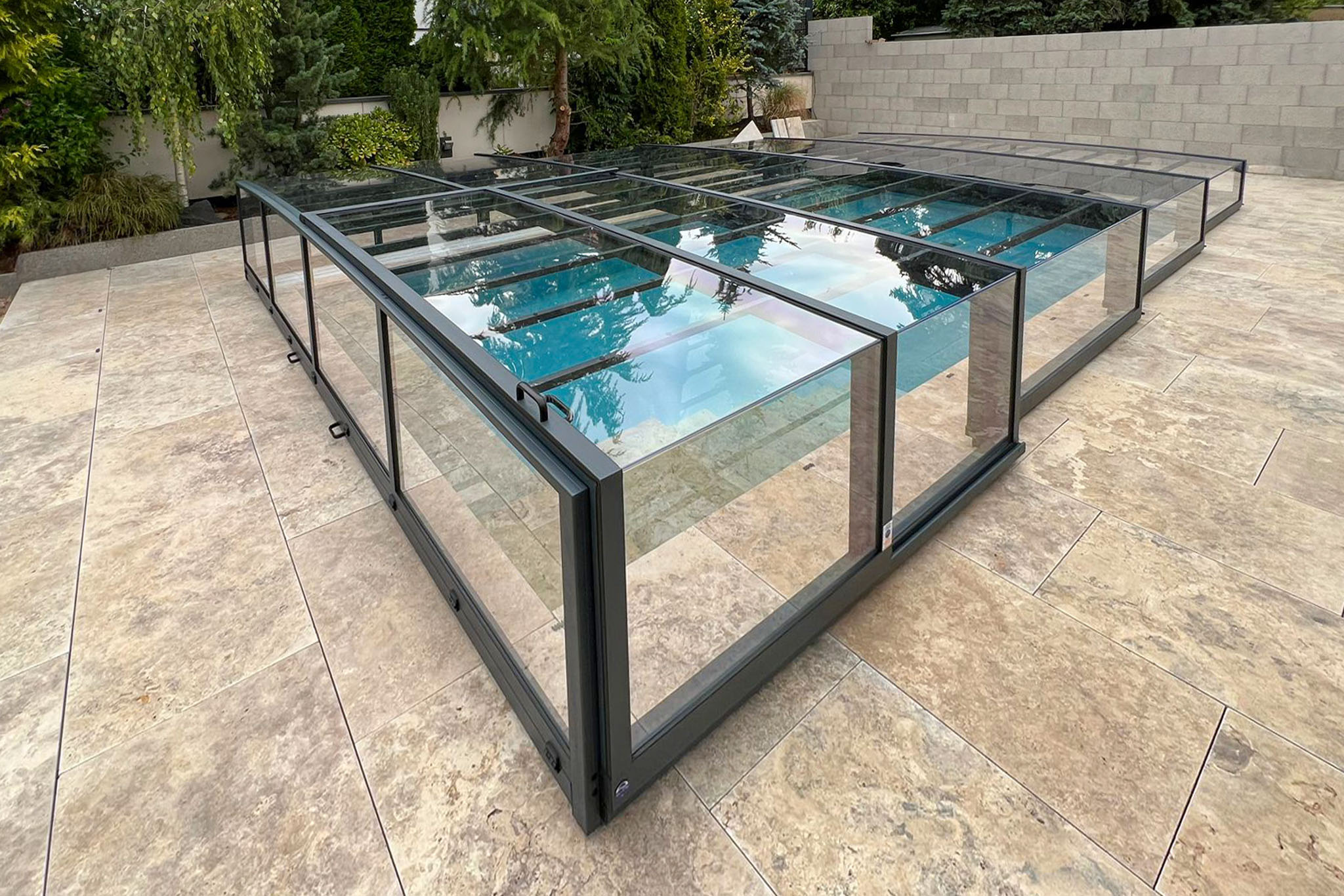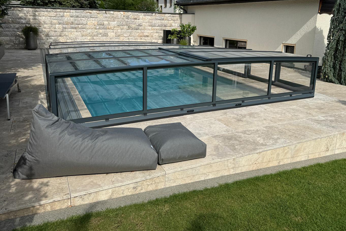 Die ALUNA® EXCLUSIVE LINE R1 Poolüberdachung rundet das Projekt perfekt ab. Mit den Maßen 5,13x8,5x0,9m bietet sie ausreichend Schutz für das gesamte Schwimmbecken. Die Überdachung ist in einem modernen RAL 7016 Farbton gehalten, der sich harmonisch in jede Umgebung einfügt.