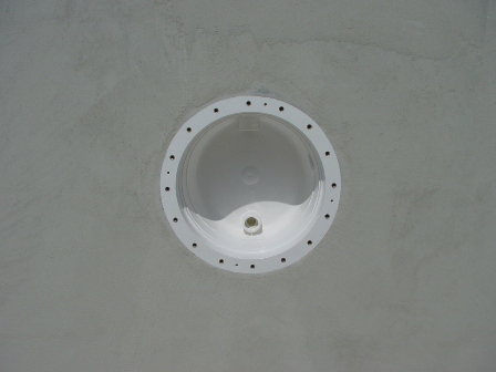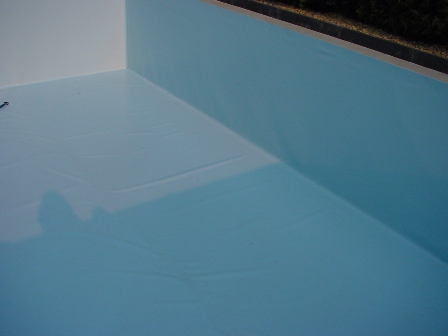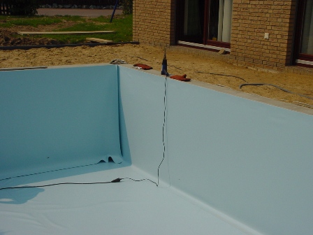 Nachdem das Vlies angebracht war, wurde das Vlies um die Einbauteile ausgeschnitten. Die Dichtflächen wurden intensiv gereinigt, danach die Dichtungen aufgeklebt. Dann konnte der Folieneinbau beginnen. Wir haben zuerst die zwei Bodenbahnen zugeschnitten und mit einer Überlappung von 5cm verschweißt. Anschließend wurden die Längsseiten an den Folienblechen angeschweißt, danach habe ich die Längsseiten mit der Bodenbahn verschweißt. Nun kamen noch die Stirnseiten, diese wurden mit einer Überlappung von 10cm mit den Längsseiten verschweißt, also mussten die Stirnseiten 22cm länger zugeschnitten werden. Die Folien für die Wände sind 1,65m breit, die Beckenwände sind 1,51m hoch, also standen unten 14 cm über, was optisch nicht besonders gut aussieht. Deswegen haben wir mit einem 10cm breiten Richtscheit, welches in die Ecken gelegt wurde, die Folie angezeichnet und abgeschnitten. Diese darf man nicht zu fest in die Ecken drücken, damit noch ein Radius in der Folie entsteht, damit sich die Folie vom Wasserdruck noch Spannen kann, um evtl. Falten glatt zuziehen. Nachdem die 40m Schweißnähte fertig waren, wurden die Nähte noch mit flüssig PVC versiegelt. Hier nach wurde der Bodenablauf eingedichtet. Anschließend wurde die Folie gereinigt, aufgeräumt und dann Wasser eingelassen. Mit steigendem Wasserstand wurden die übrigen Einbauteile, angefangen bei den unteren Einlaufdüsen, Unterwasserscheinwerfer, Leiter, oberen Einlaufdüsen und schließlich die Skimmer eingedichtet.
