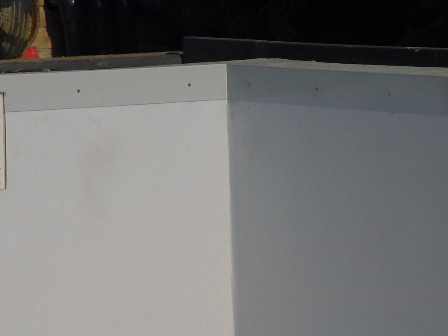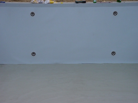 Zuerst wurde das Becken komplett desinfiziert, das Fungizid habe ich mit 4 Liter Wasser verdünnt, in einer normalen Gartenspritze auf die Beckenwände und den Fußboden gleichmäßig aufgespritzt. Bei dem guten Wetter war das Zeug auch sehr schnell trocken. Dann haben wir das Vlies an den Beckenwänden angebracht. Mit einem Quast wurde der Kleber punktweise verteilt, was die Montage enorm erleichterte. Darauf hin haben wir die Folienbleche am Beckenrand angedübelt, diese haben den Vorteil, das man Höhenunterschiede von den Beckenwänden sehr gut ausgleichen kann. Hier fängt man an der höchsten Stelle an, dann arbeitet man sich mit der Wasserwaage rund um das Becken. Ein weiterer Vorteil gegenüber Winkelblechen ist, das man den kompletten Beckenrand frei für die Befestigung der Beckenrandsteine, Fliesen o. Terrassenplatten hat. Falls das Becken mal saniert werden muss, können die Beckenrandsteine liegen bleiben. Die Folienbleche habe ich mit Edelstahlsenkschrauben angedübelt, diese sieht man auch nicht mehr.