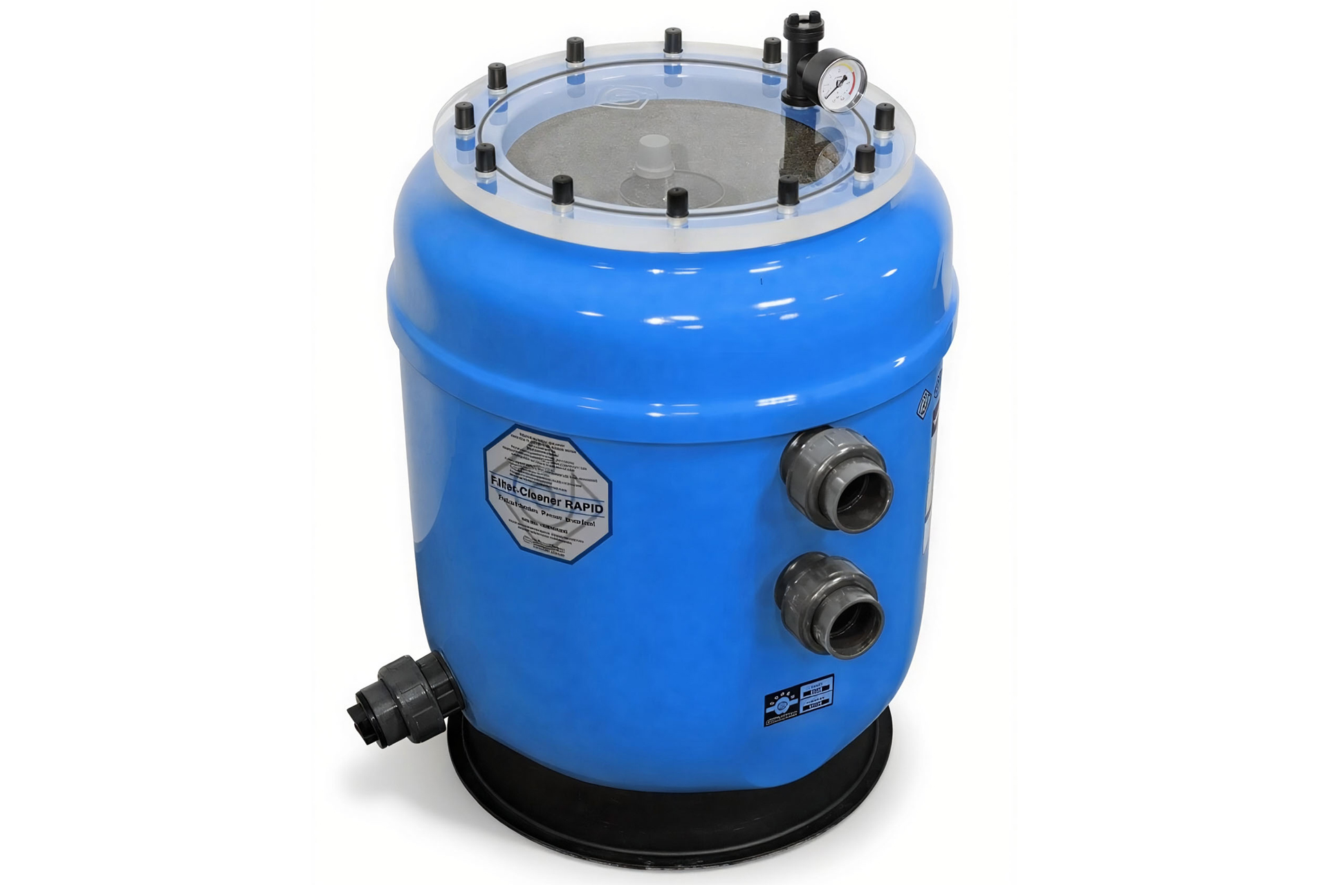 Die Filterbehälter bestehen aus hochwertigem, glasfaserverstärktem Polyester (GFK). Dieses Material ist UV-beständig, korrosionsfrei und widersteht dauerhaft Chlor- sowie Salzwasser bis 5 g/l. Die Füll- und Wartungsöffnung DN 290 ermöglicht einfachen Zugang zum Filtermedium. Der optionale Plexiglasdeckel erlaubt die visuelle Kontrolle des Filterbetts ohne Öffnung des Behälters.
