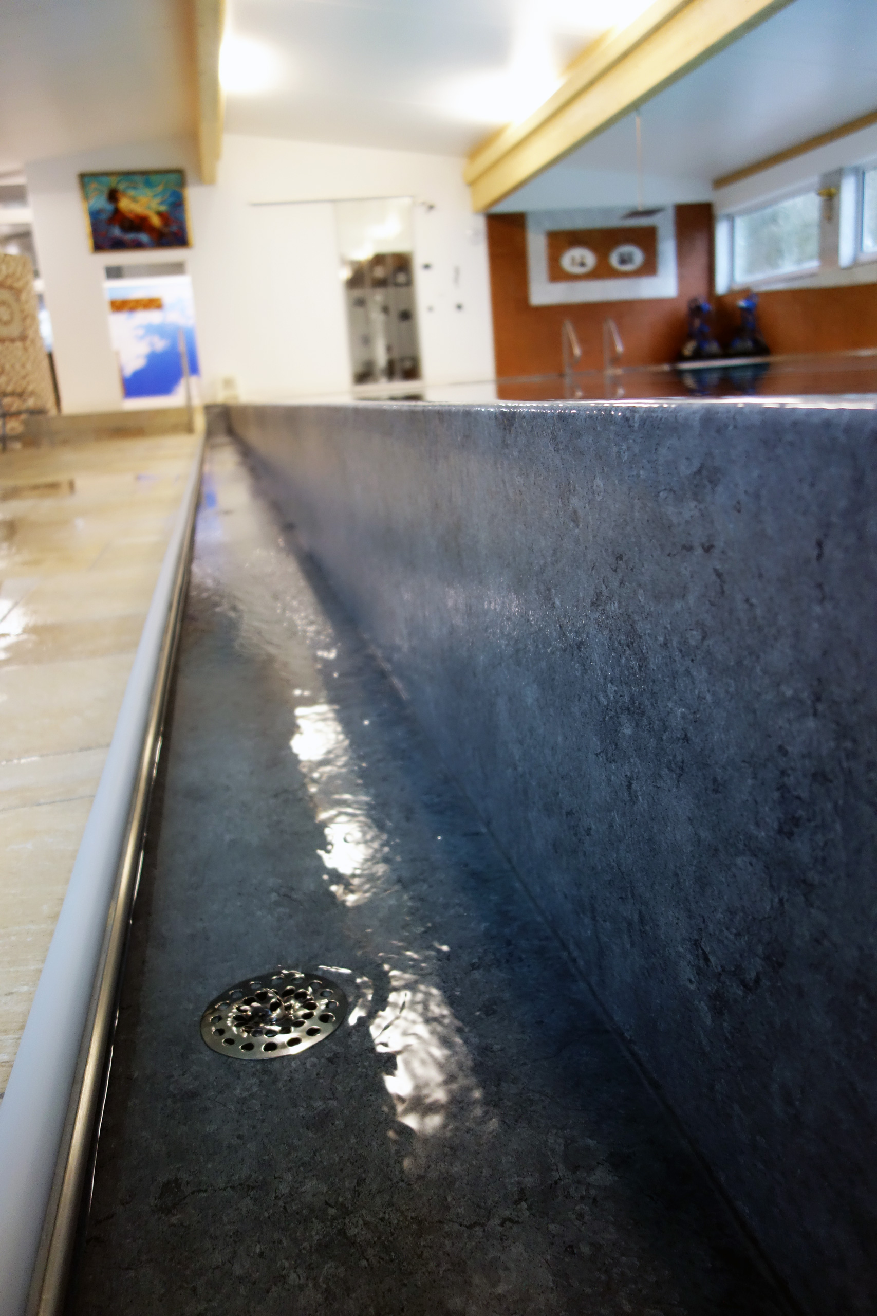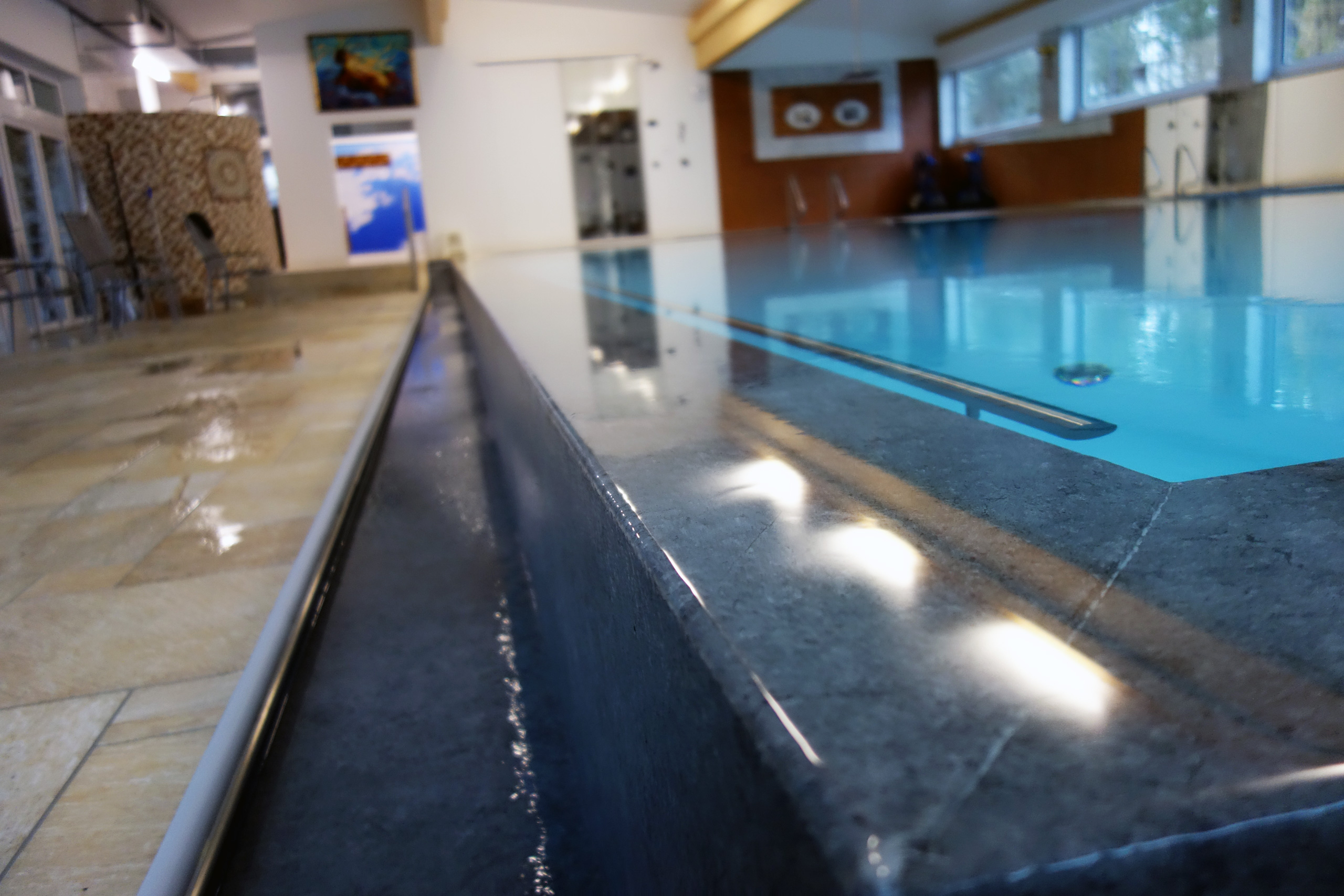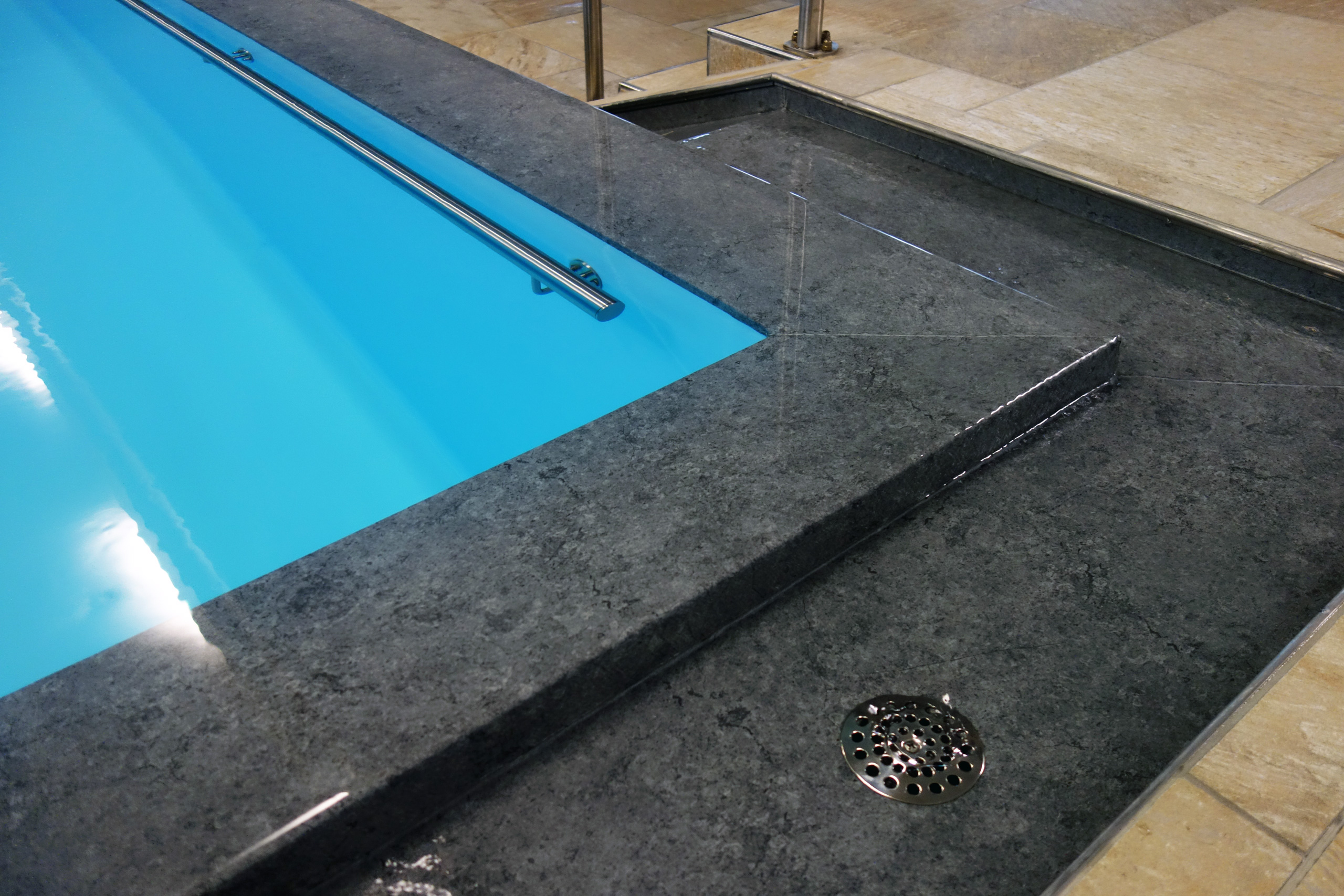 Betonbecken mit umlaufender Überlaufrinne in den Maßen 5,5 x 14,5 x 1,26 m inkl. Edelstahltreppe und Handlauf