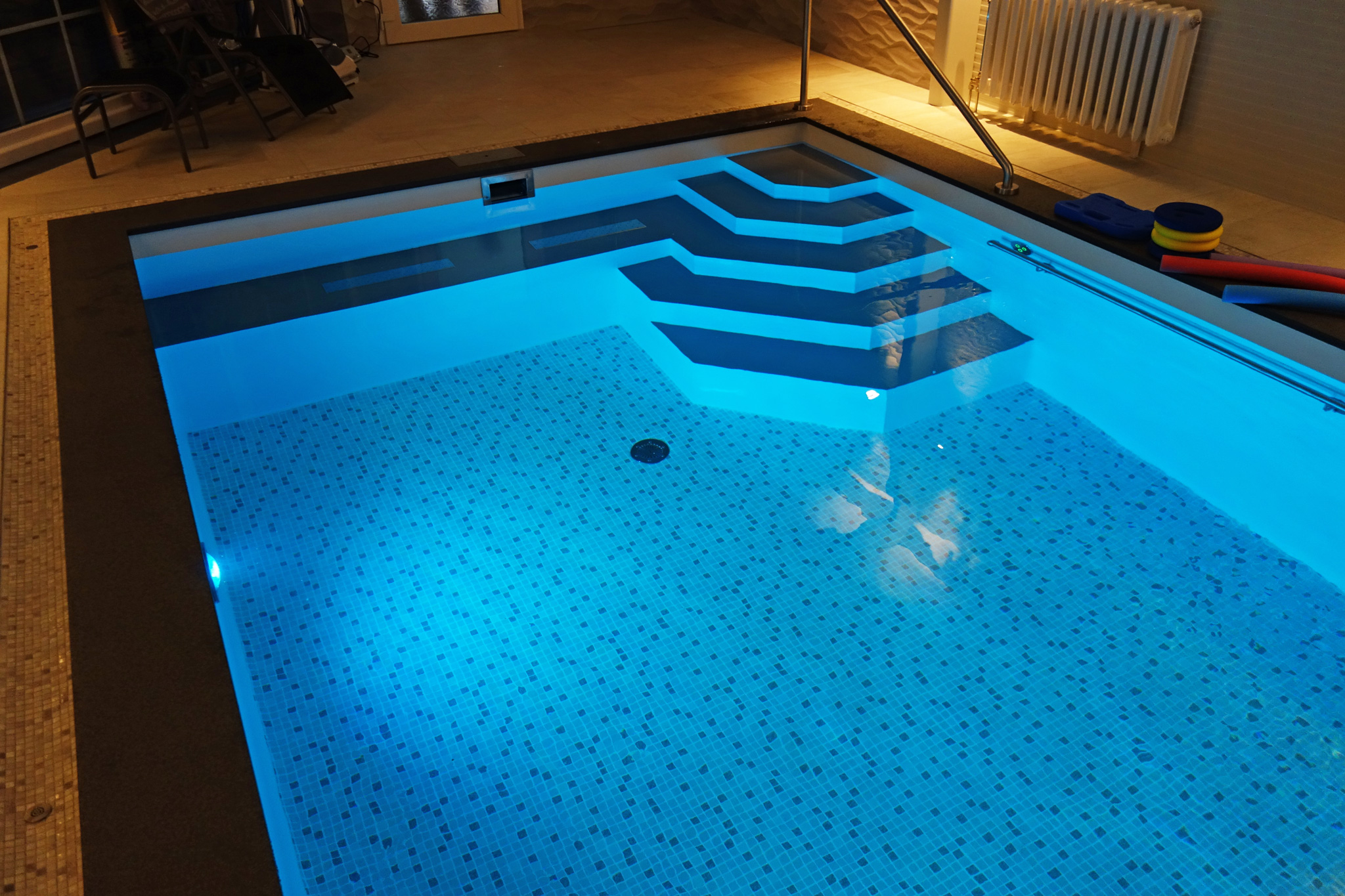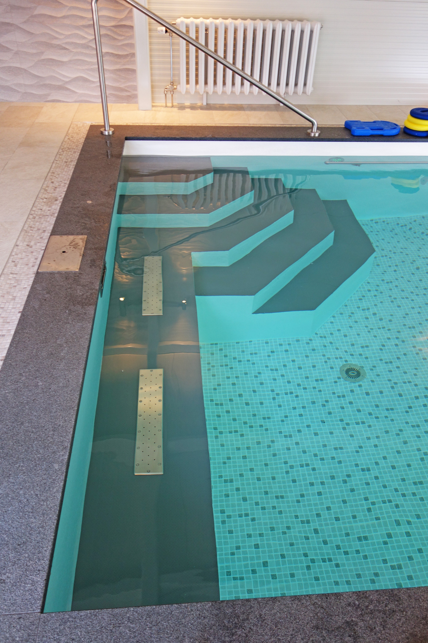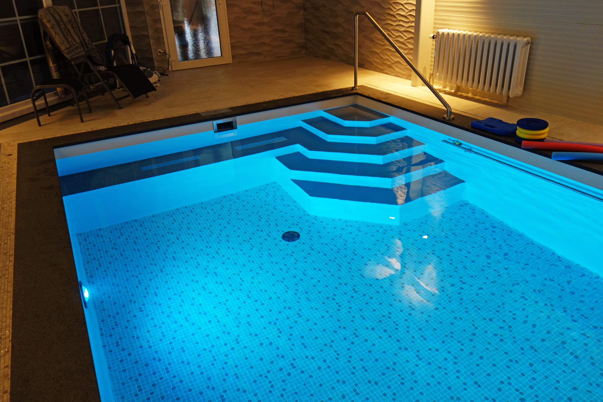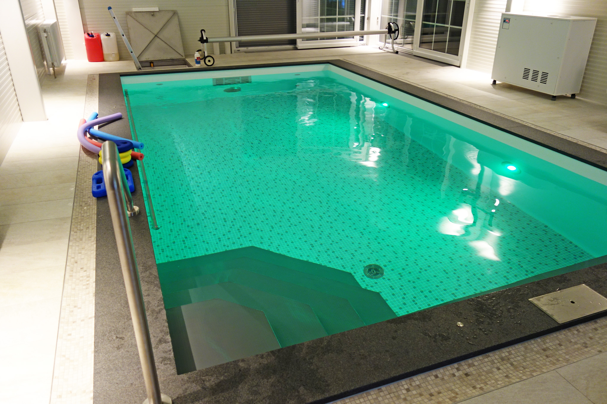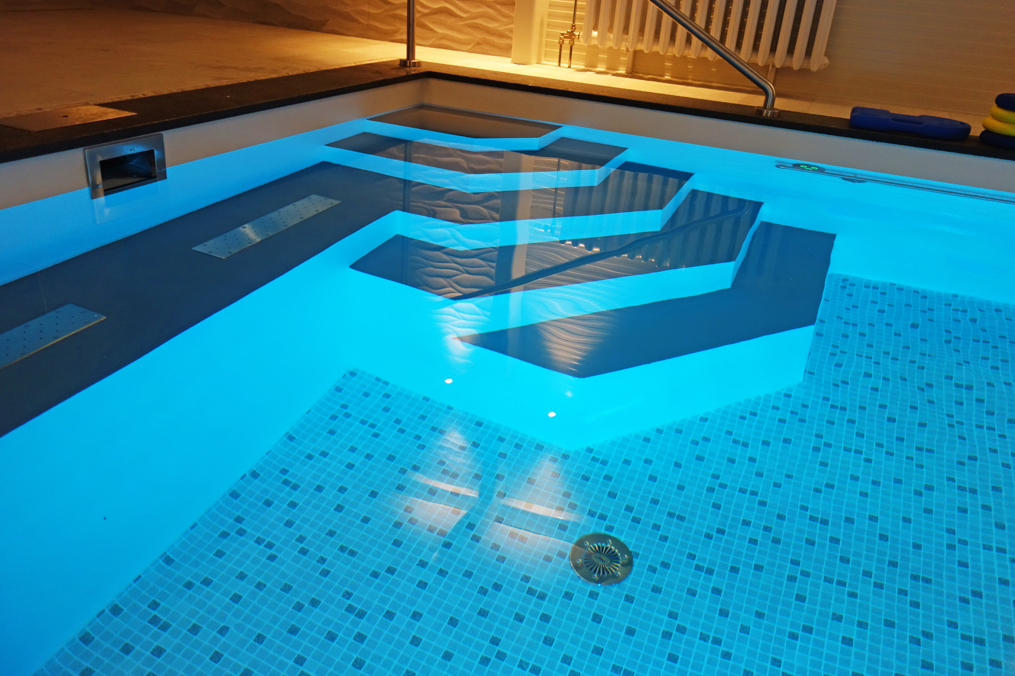 Hallenbecken 3,5x6,7x1,5m mit Ecktreppe, Podest und Strömungsturbine