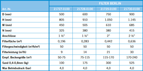 Filterdurchmesser | Filterhöhe | Filtersand (Körnung) | max. Durchfluß | Anschluß |