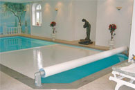 mit maximaler Dampfsperre – ideal für Hallenbäder Die Mehrschichtfolien-Abdeckung THERMOROLL ist eine dampfdichte Isolierplane, die auf dem Wasser schwimmt. THERMO-ROLL bürgt für beste Isolationswerte, im Freien wie im Hallenbadbereich. Der Antrieb kann manuell oder motorisch erfolgen. Das Öffnen oder Schliessen geschieht halbautomatisch. Mit der Rollladenvorderkante schiebt sich THERMO-ROLL bei rechteckigen Becken weitestgehend selbst über das Wasser. Auf Wunsch lagert die Abdeckung unter einer Sitzbank oder unter einer halbrunden Verkleidung.