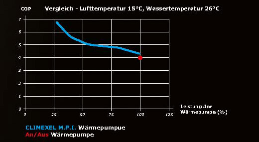 Auf höchster Leistungsstufe (100 Hz) erzielt eine Climexel MPI Wärmepumpe etwa den gleichen COP, den eine An/Aus-Wärmepumpe bei 50 Hz erreicht. Nähert sich die Temperatur des Schwimmbadwassers aber ihrem Sollwert, so sinkt bei einer Climexel MPI Wärmepumpe die Rotationsgeschwindigkeit von Kompressor und Ventilatoren; der COP steigt beträchtlich an, der Geräuschpegel hingegen nimmt ab.