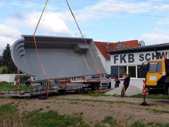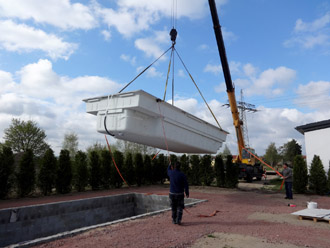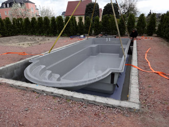 Ein Kran hebt nun das Becken in die Baugrube. Nach dem Aufsetzen des Schwimmbeckens sollte das Niveau nochmals mit einem Lasergerät (bzw. Nivelliergerät) überprüft werden, um es exakt in Waage zu bringen.