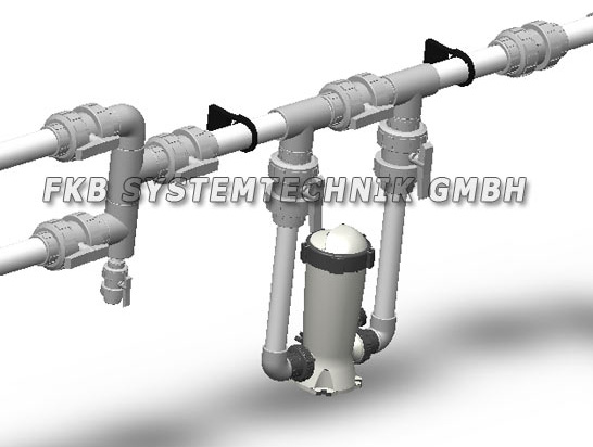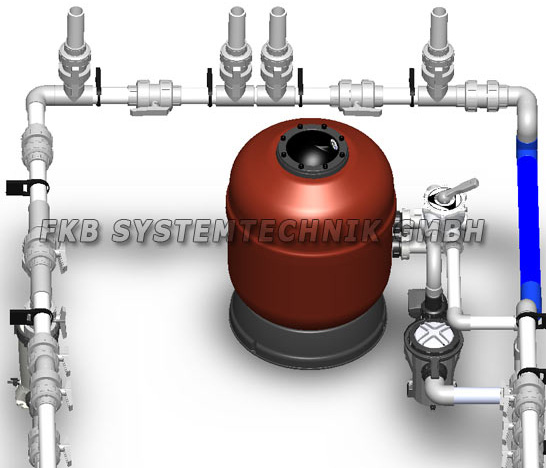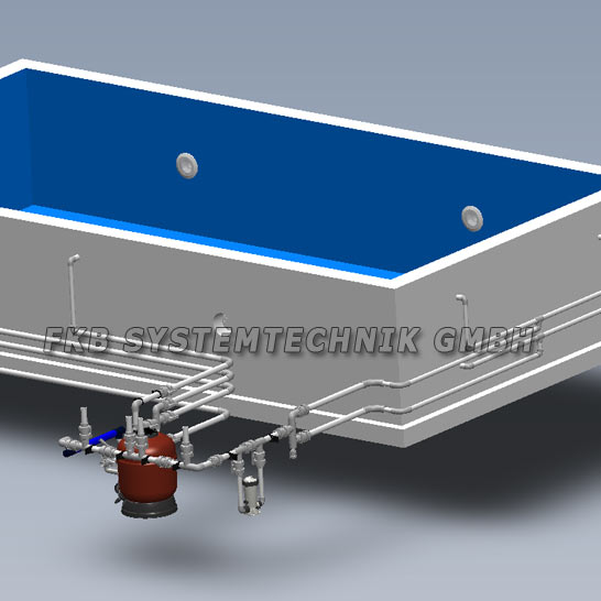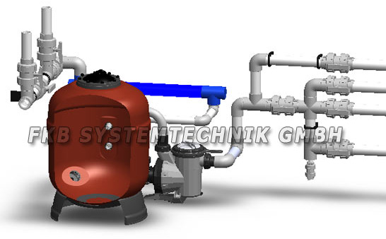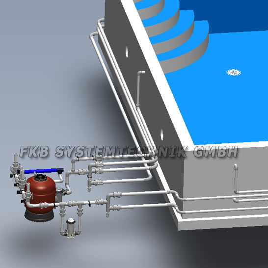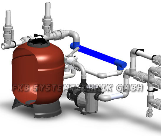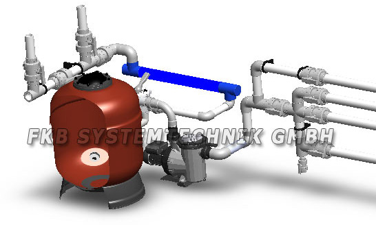 Nach diesem wird das Wasser zu den Einlaufdüsen geführt. Für die Einbindung von Solaranlage / Wärmetauscher / Wärmepumpe oder anderen Zusatzelementen werden i.d.R. Bypässe installiert.