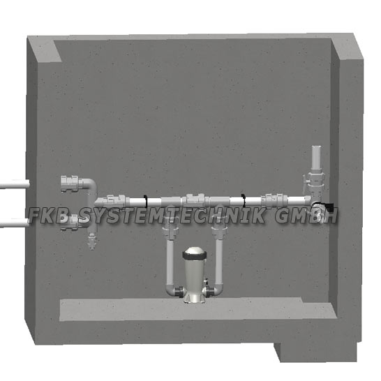Die gezeigte Verrohrung wird auf obere und untere Einlaufdüsen über einen Kugelhahn aufgeteilt.