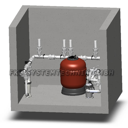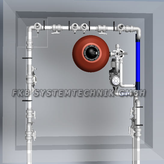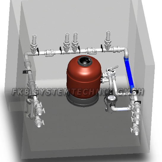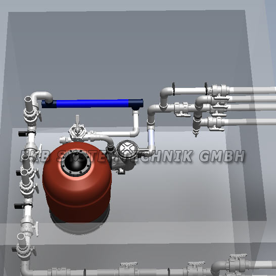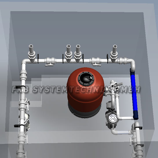 Bei dem hier gezeigten Technikraum handelt es sich um eine Beispielinstallation für private Schwimmbecken von ca. 3,5*7,0 - 5*10 m . Die Verrohrung ist für 2 Skimmer, 1 Bodenablauf, 1 Bodensaugeranschluss sowie 2 x 2 Einlaufdüsen konzipiert.
