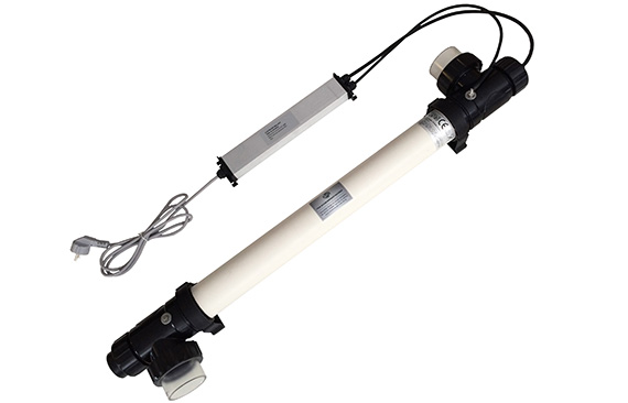Nebenstehendes Bild zeigt eine Sandfilteranlage mit Ansaugverrohrung, UV-Lampe, Bypässen und Chlordosierer.
