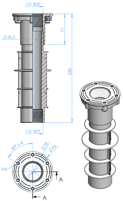 • Wanddurchführung 250 mm mit 1½" IG und Klebeanschluss d= 50 mm, mit Sacklöchern und Gewindeeinsätzen