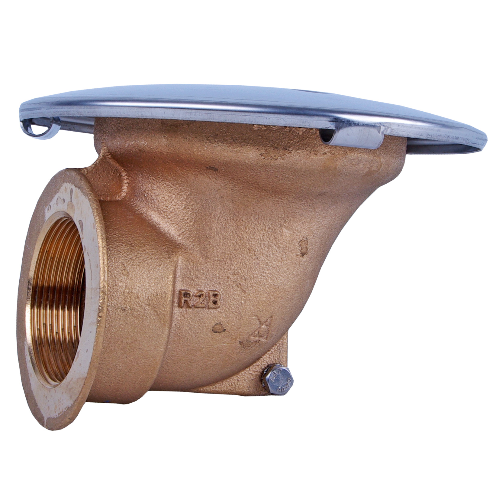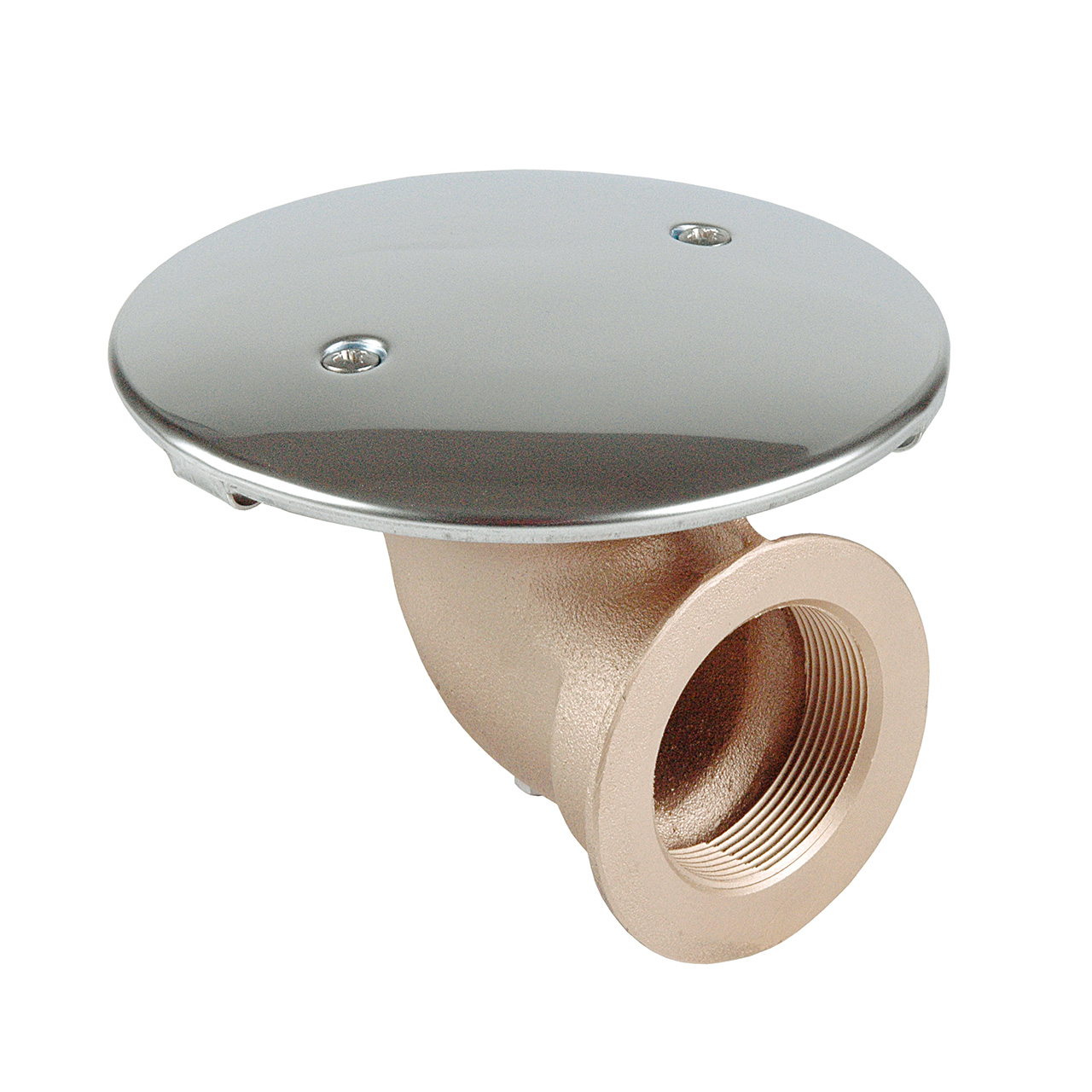 Ablaufkasten mit senkrechtem bzw. 90° Abgang und G 1 1/2" bzw. 2" IG Anschlußgewinde, komplett aus Rotguß, Bronze oder V4A mit Antiwirbeldeckel d=168 mm aus Edelstahl (V4A).