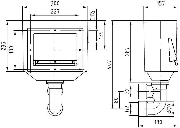 NiSn-beschichtet. Einbautiefe 160 mm, mit Skimmerklappe und Siebkorb aus Kunststoff und einem regelbaren 2-Wege-Steuerventil zum Anschluß eines Bodenablaufes.