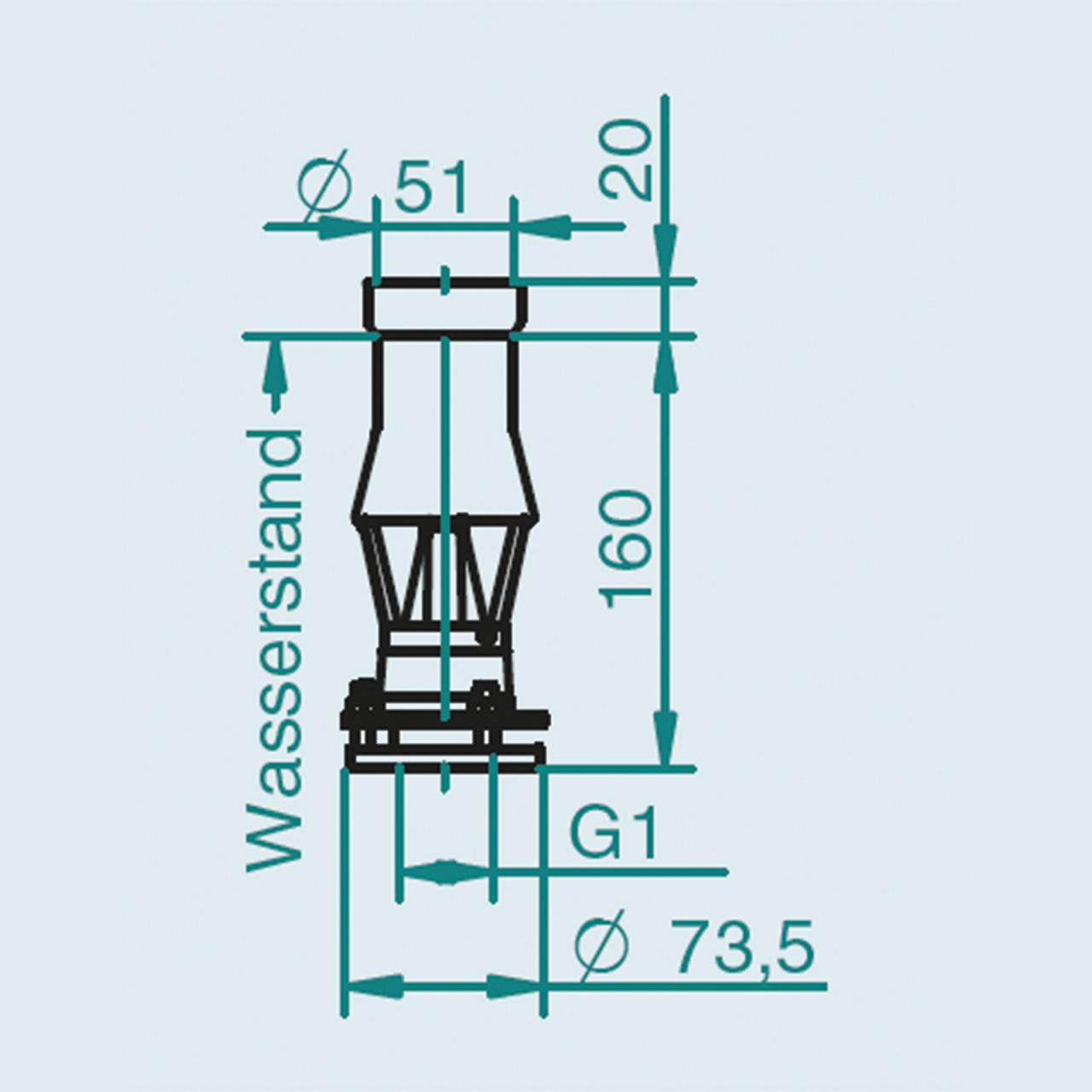 Wasserstandsabhängige Injektordüsen, die ein gischtartiges Wasserbild bilden, das von einer breiten Basis aus spitz zuläuft.