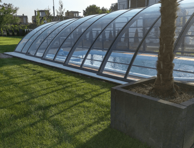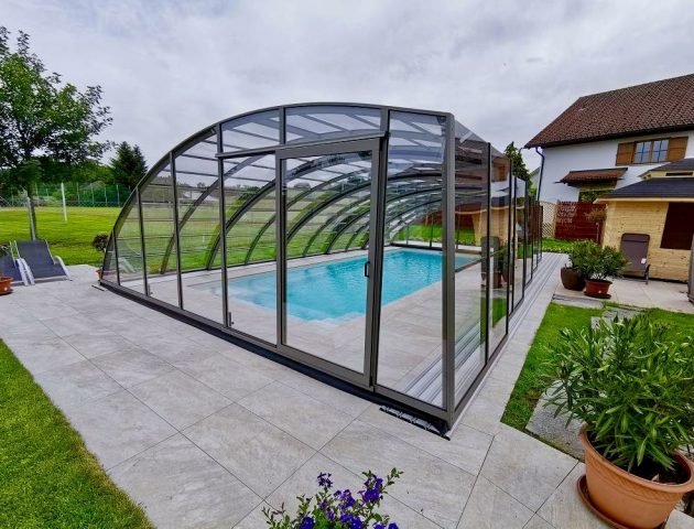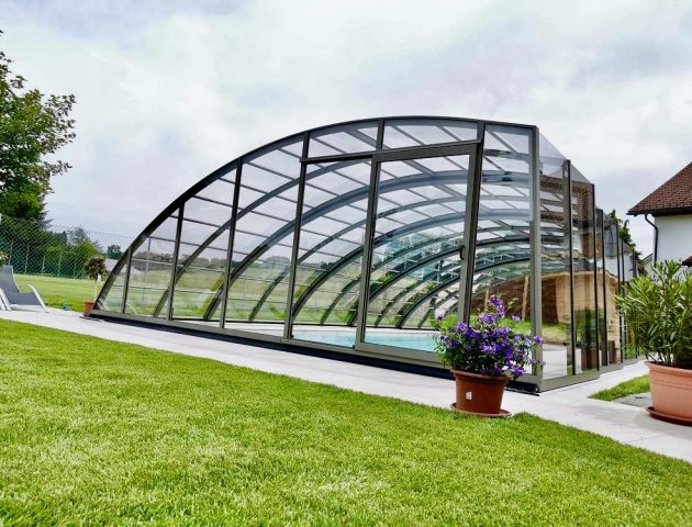 Diese hohe Poolüberdachung überzeugt mit besonderer Stabilität – selbst bei starkem Wind. Die gewölbte Seitenstruktur leitet Regen und Schnee zuverlässig ab. Eine praktische Eingangstür in der Giebelwand ermöglicht bequemen Zugang zum Pool. Zusätzlich kann das Pooldach mit seitlichen Schiebetüren ausgestattet werden, die den Einstieg von beiden Seiten ermöglichen.