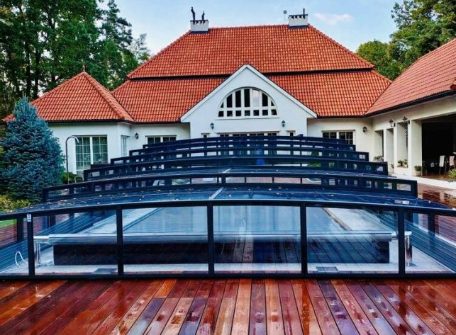 Ein besonderes Highlight dieses Modells sind die markanten Übergänge zwischen den Segmenten und die variierenden Höhen, die der Konstruktion einen einzigartigen Charakter verleihen. Großzügige Schiebetüren sorgen für maximalen Bedienkomfort und einen bequemen Zugang zum Pool – auch bei geschlossener Überdachung.