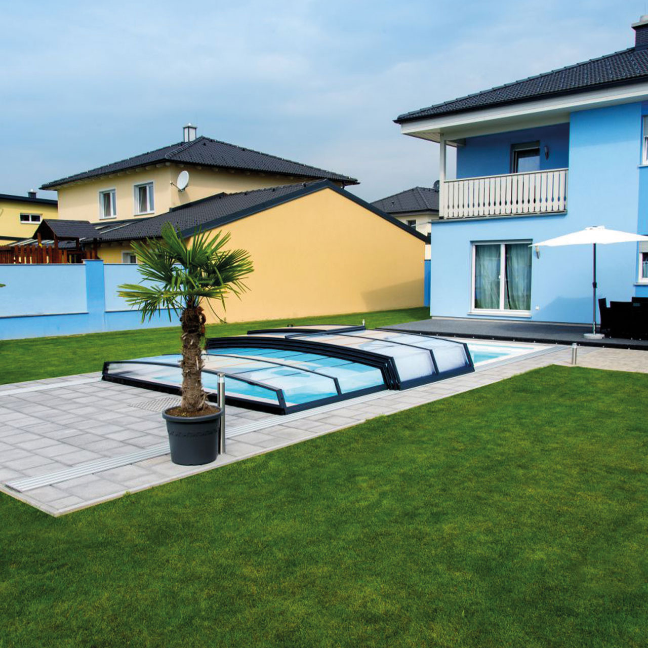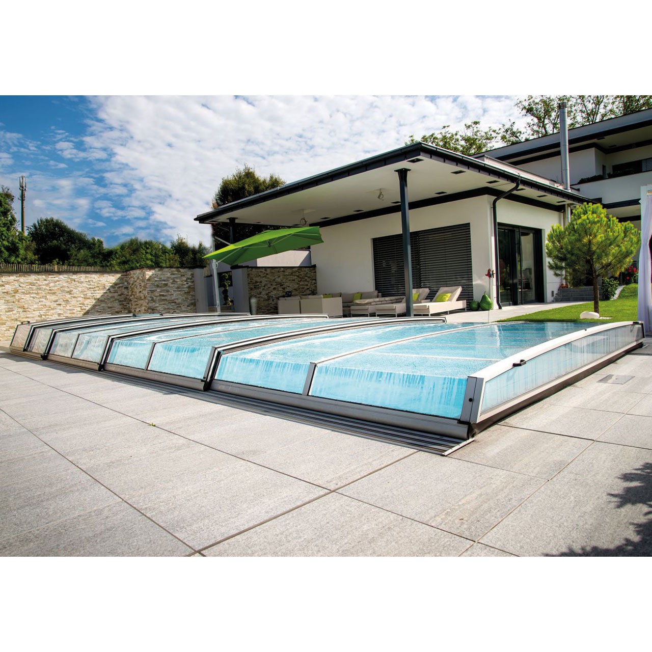 Die Poolüberdachung hilft effektiv das Wasser zu erwärmen und reduziert somit den Wärmeverlust und die Heizkosten.