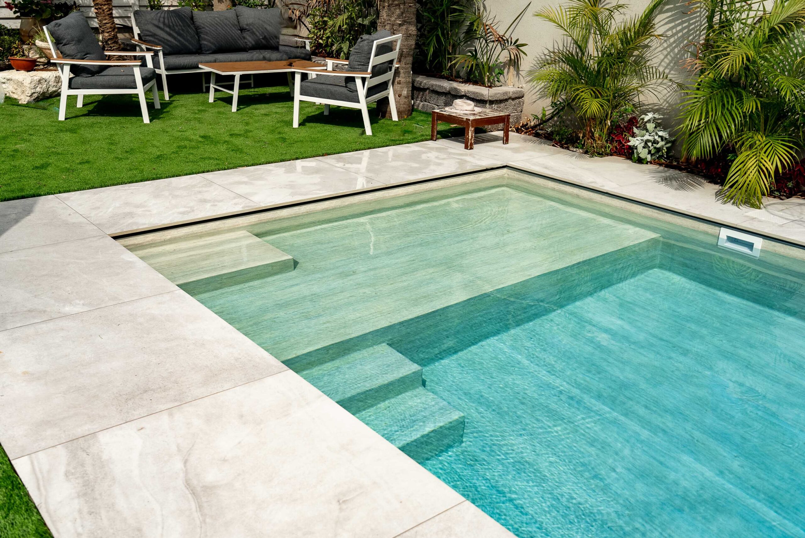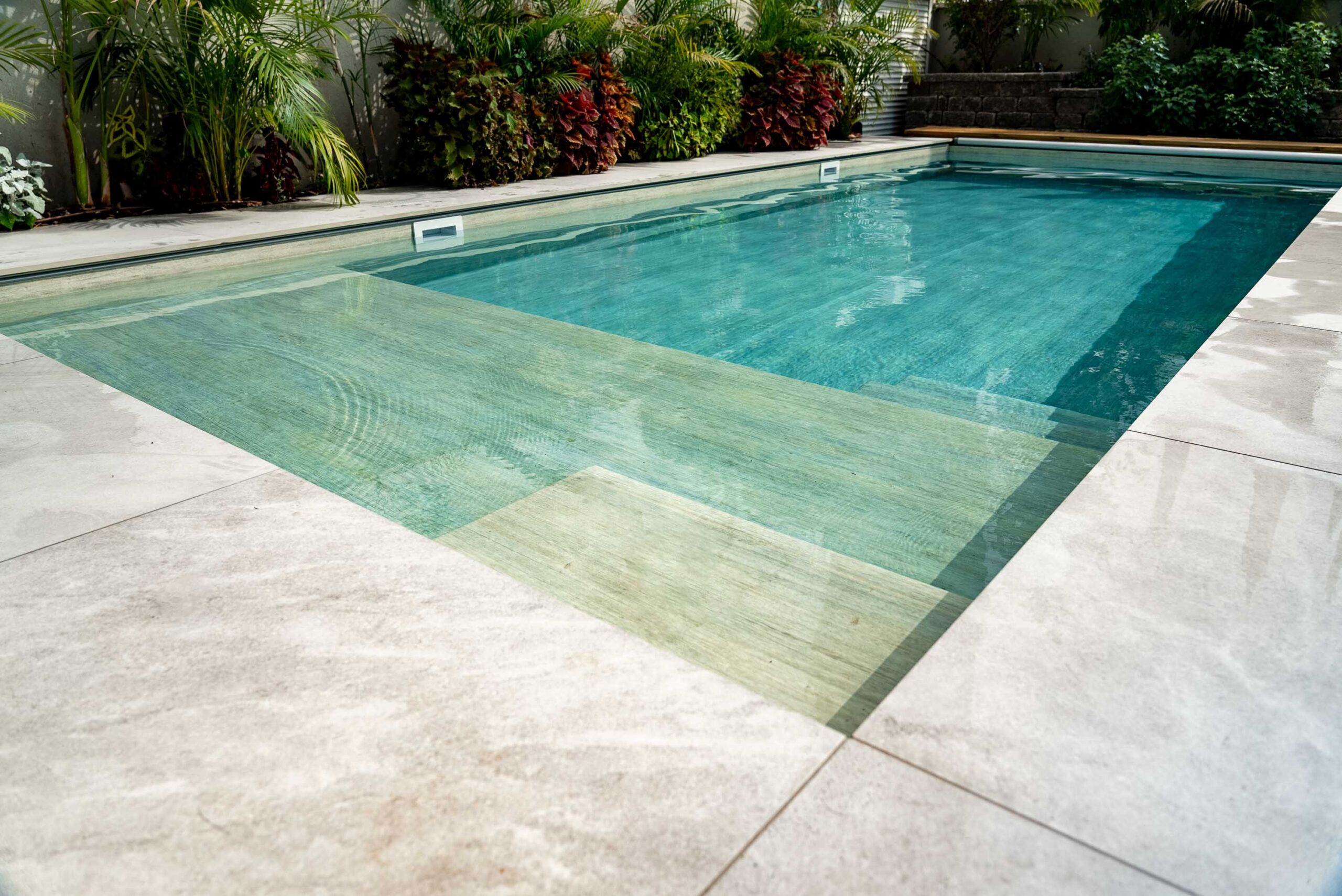 Die Poolfolie besteht aus robustem PVC mit einer Gesamtstärke von 1,5 mm. Das Premium-Material wurde speziell für Schwimmbäder und Pools formuliert und bietet eine ausgezeichnete Resistenz gegen Chlor, UV-Strahlung und chemische Verschmutzungen. Die Oberflächenstruktur mit 3D-Embossing ermöglicht sowohl die optische Wirkung als auch die erhöhte Rutschfestigkeit (Klasse C nach Norm).