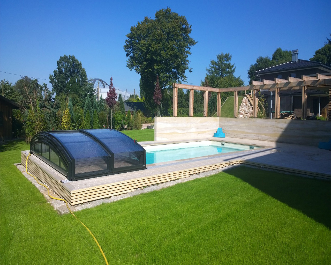 Betonbecken mit den Maßen 4 x 8 x 1,55 m mit Ecktreppe, Sitzbank und Schiebehalle Casablanca Infinity B