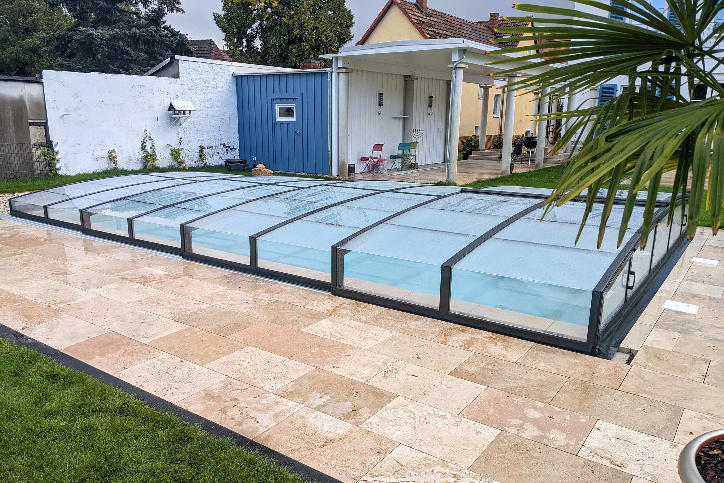 Die Überdachung besteht aus vier Segmenten, die sich leicht verschieben lassen. Dies ermöglicht es den Poolnutzern, je nach Wetterlage und Vorlieben, Teile des Pools freizulegen oder komplett zu überdachen.