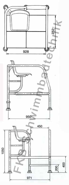 Ein Sitz für Rettungsschwimmer ist in jedem kommunalen Bad erforderlich, in denen eine erhöhte Plattform zur Überwachung benötigt. Der um 90° drehbare Sitz ist von vorne oder auch von hinten zugänglich. Die Konstruktion besteht aus V2A Edelstahl mit einem Holmdurchmesser von 43 mm, der Sitz die Plattform und die stufen sind aus Kunststoff.
