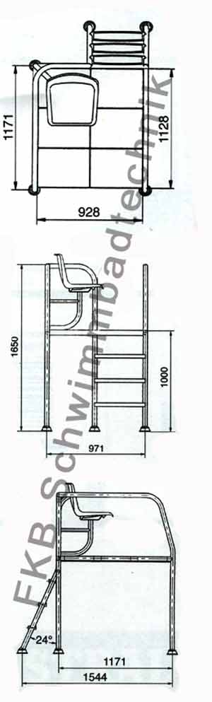 Ein Sitz für Rettungsschwimmer ist in jedem kommunalen Bad erforderlich, in denen eine erhöhte Plattform zur Überwachung benötigt. Der um 90° drehbare Sitz ist von vorne oder auch von hinten zugänglich. Die Konstruktion besteht aus V2A Edelstahl mit einem Holmdurchmesser von 43 mm, der Sitz die Plattform und die stufen sind aus Kunststoff.