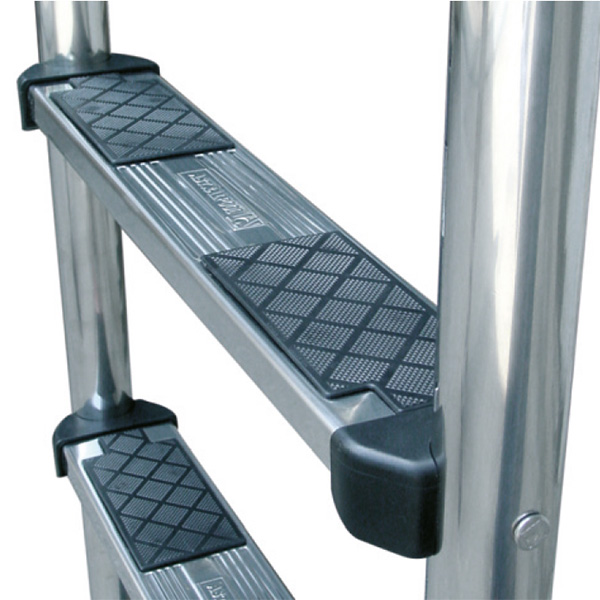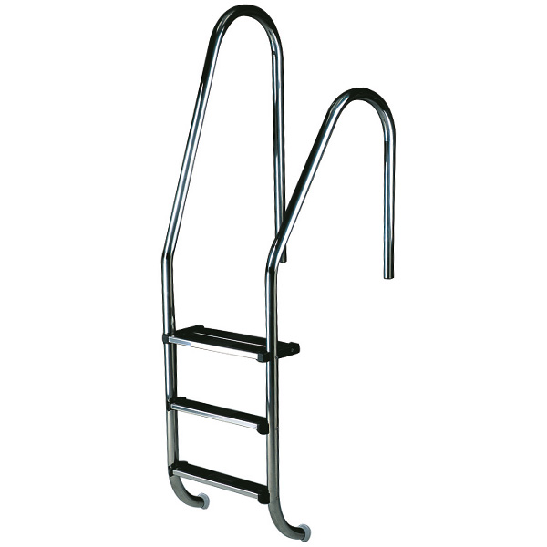 Schwimmbadleiter mit unterschiedlich hohen Leiterholmen aus poliertem Edelstahl mit einem Holmdurchmesser von 43 mm. Die Stufen sind mit besonders rutschfester Kunststoffauflage (Typ Deluxe) ausgestattet.
