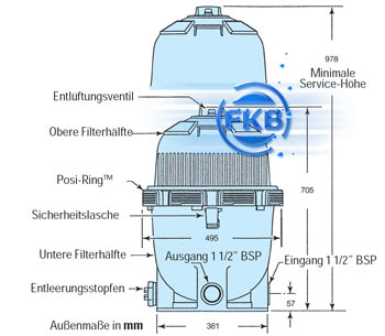 Gewindeschraubverschluss »POSI-Ring«, ein neues patentiertes Gewinde Verschlusssystem ist sicher und einfach zu handhaben. Durch eine besondere Verschlusskonstruktion kann der Gewindeschraubring leicht gelöst werden. Zum öffnen des Filterkessels Lasche eindrücken und Ring abschrauben.