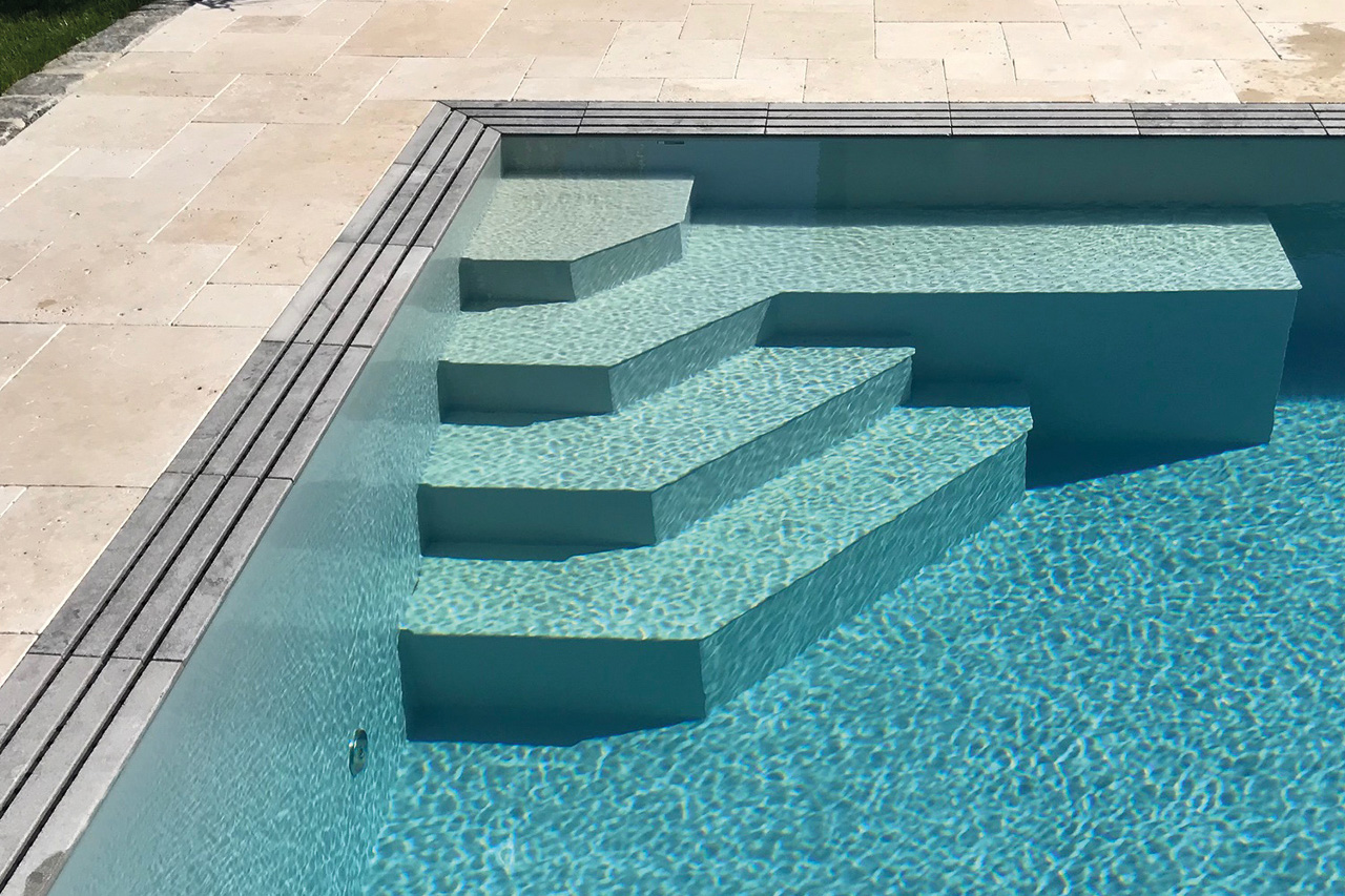Überlaufbecken Overflow Stone EVO 8,0x3,5x1,35m mit 2 Ecktreppen Achteck und Sitzbänke