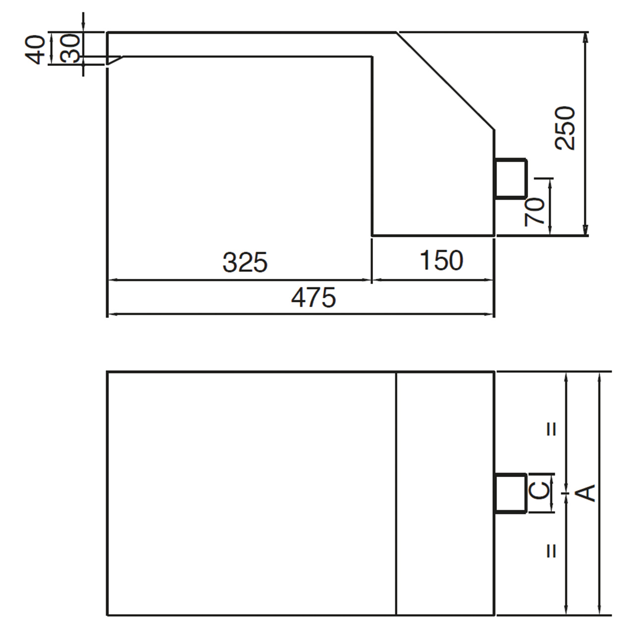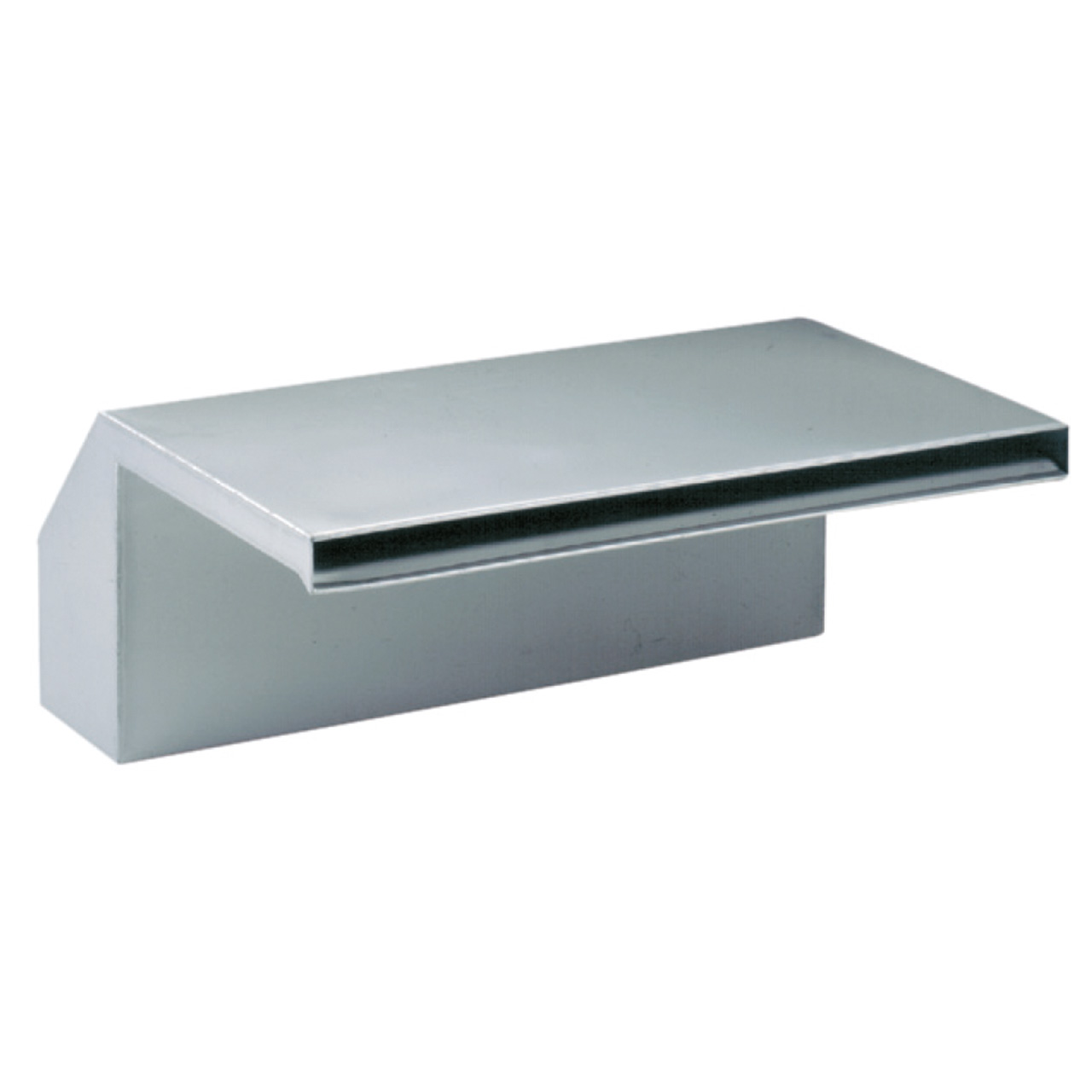 Wasserfall aus hochglanzpoliertem V4A, 300 bzw. 600 mm breit. Anschluss 1 1/2” bzw. 2". Wasserfall für Montage unter den Beckenrandsteinen.
