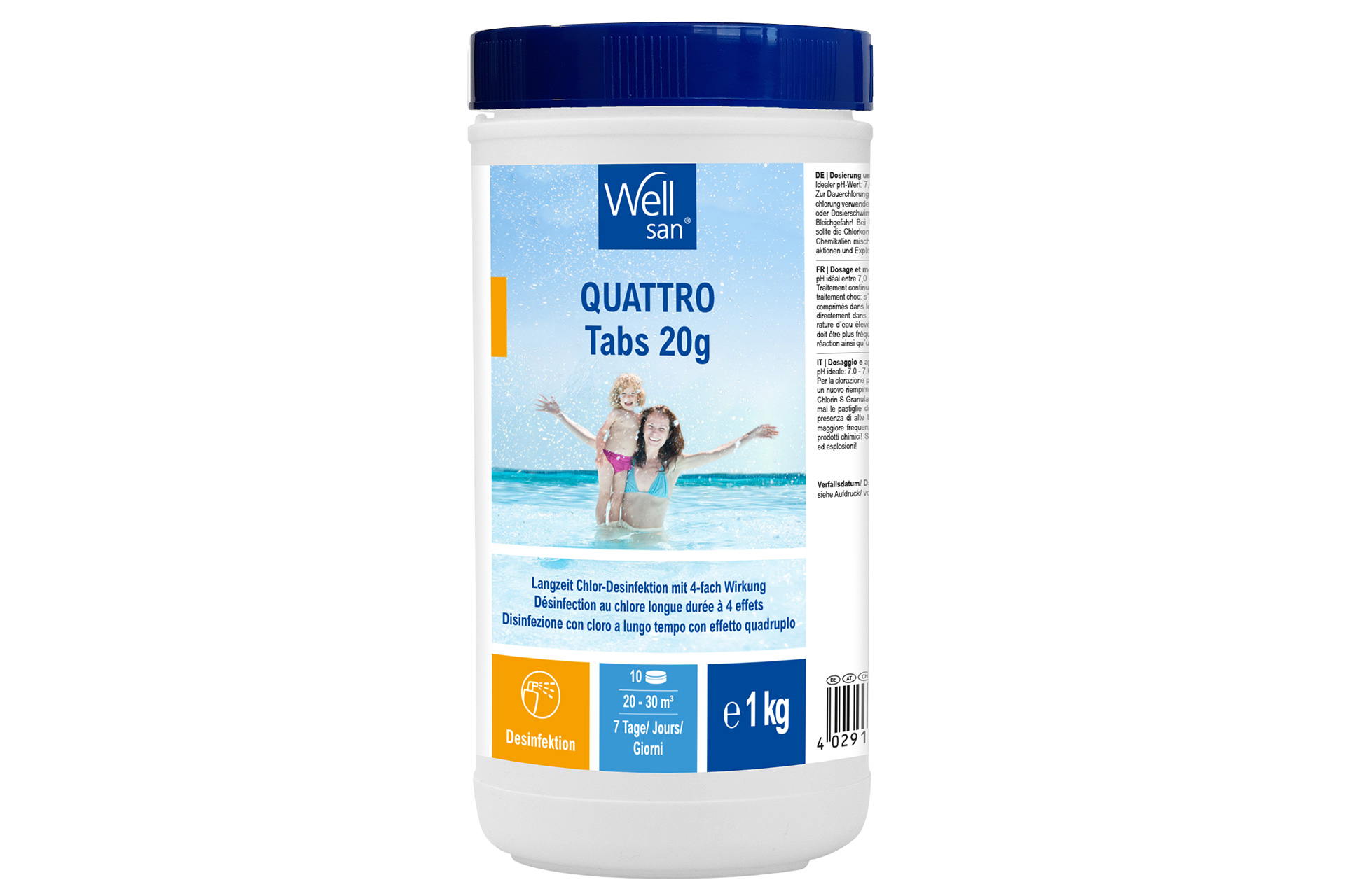 WELLSAN Quattro Tabs 20g sind ein innovatives Produkt für die Pflege Ihres Schwimmbadwassers. Sie vereinen vier Funktionen in einer Tablette, die für eine optimale Desinfektion, Flockung, Algenprävention und Stabilisierung sorgen. Sie eignen sich besonders für kleine Schwimmbecken (bis ca. 20 m³ Inhalt). Damit sparen Sie Zeit, Geld und Mühe bei der Reinigung Ihres Pools.